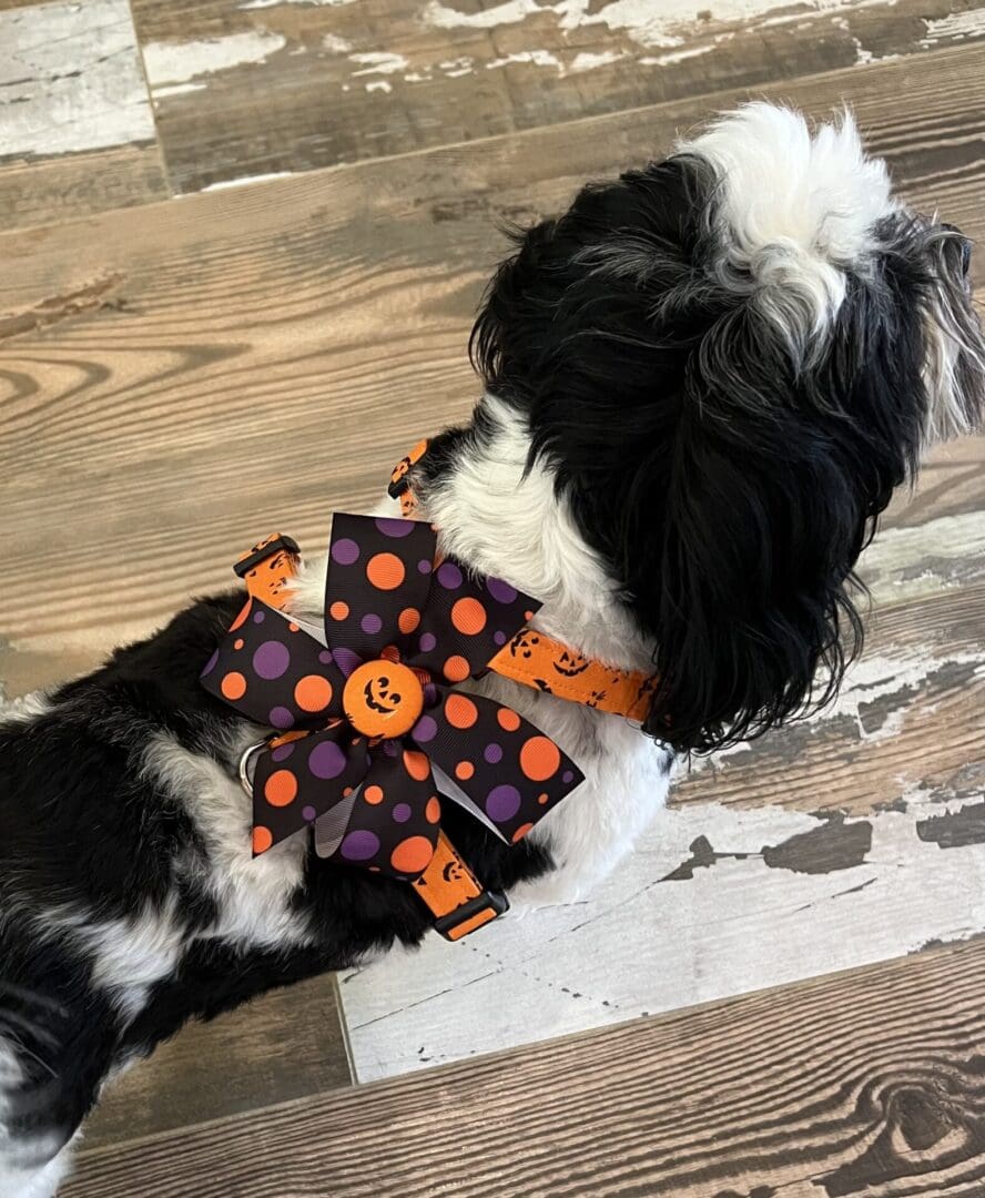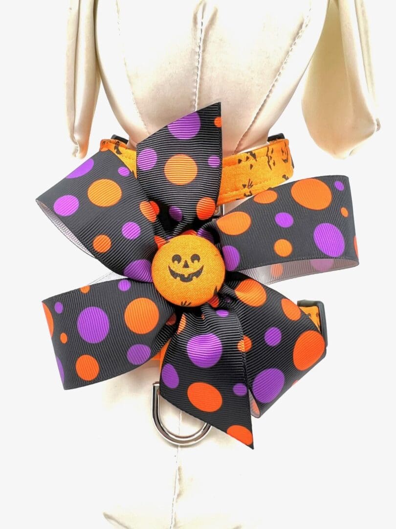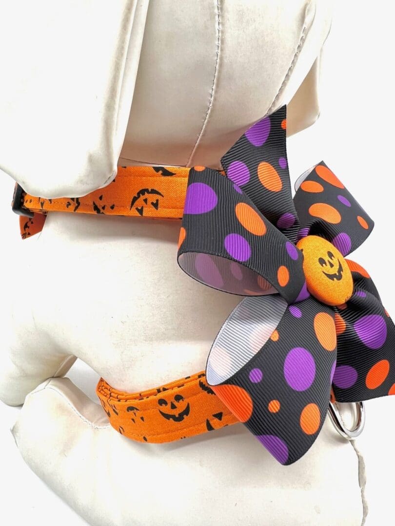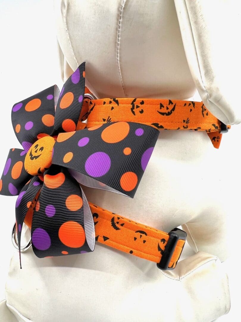 Fall Halloween Black Orange Pumpkins Purple Orange Dots Dog Harness- Add on Removable Bow or Bow Tie