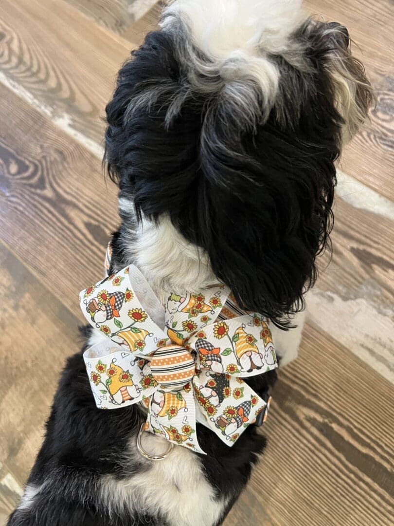 Be the first to review “Fall Halloween Thanksgiving Black Orange Diagonal Stripe Orange Dots Gnome Ghost Dog Harness- Add on Removable Bow or Bow Tie- Your Choice”