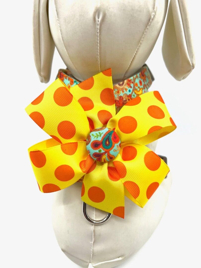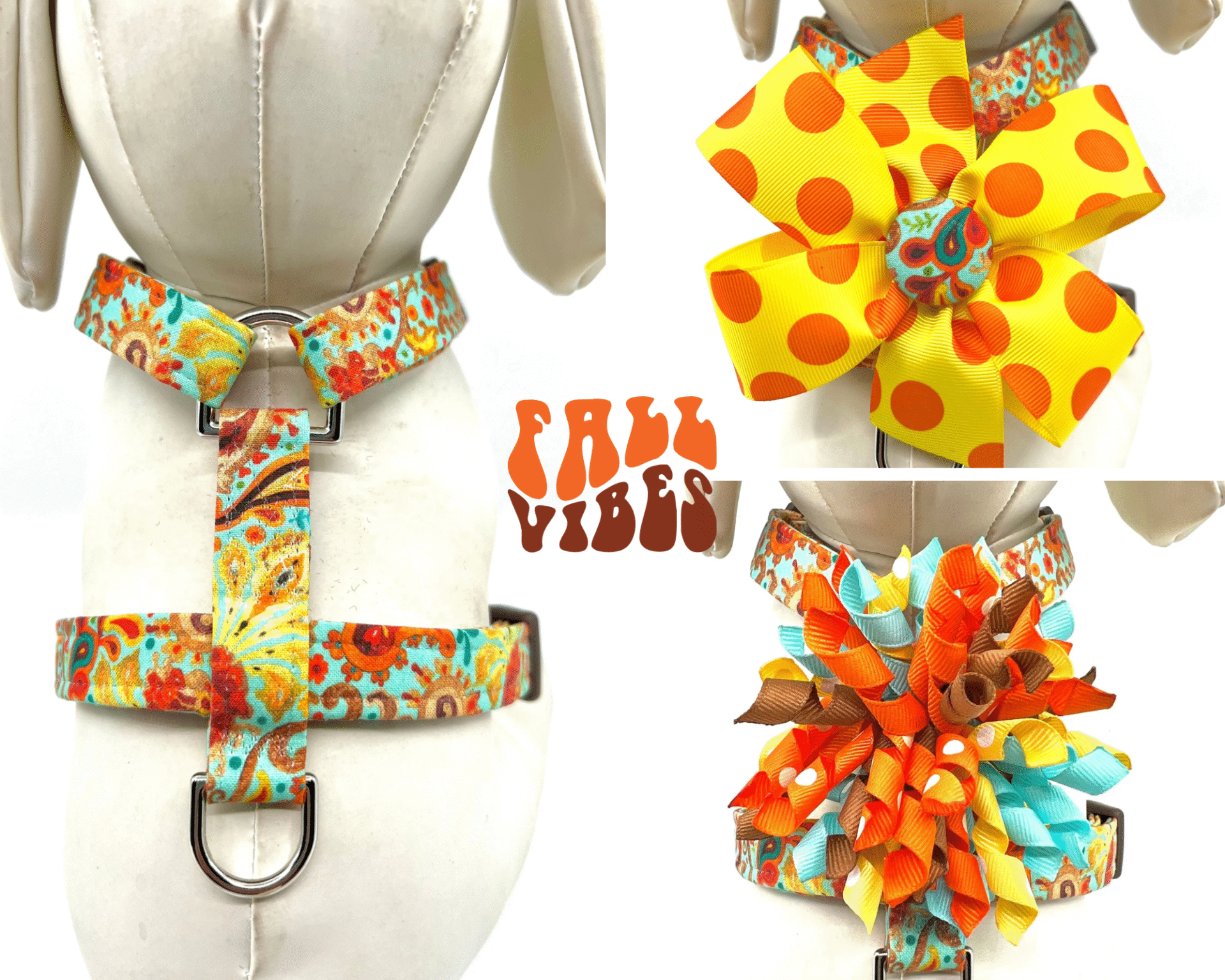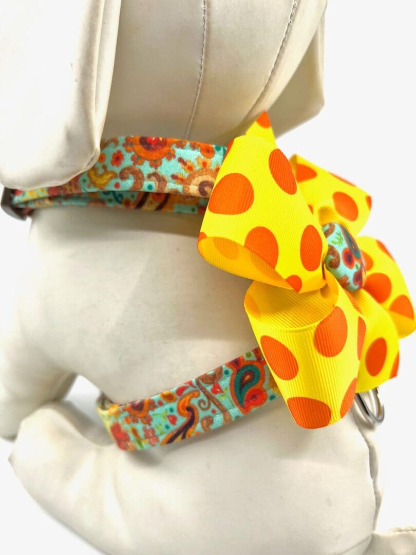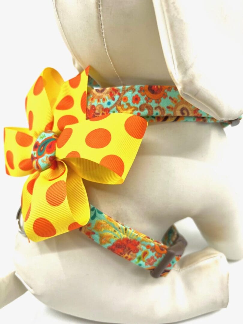 Fall Halloween Thanksgiving Teal Yellow Orange Brown Paisley Polka Dot Dog Harness- Add on Removable Bow or Korker Bow