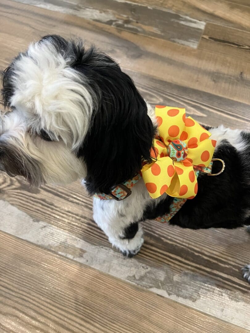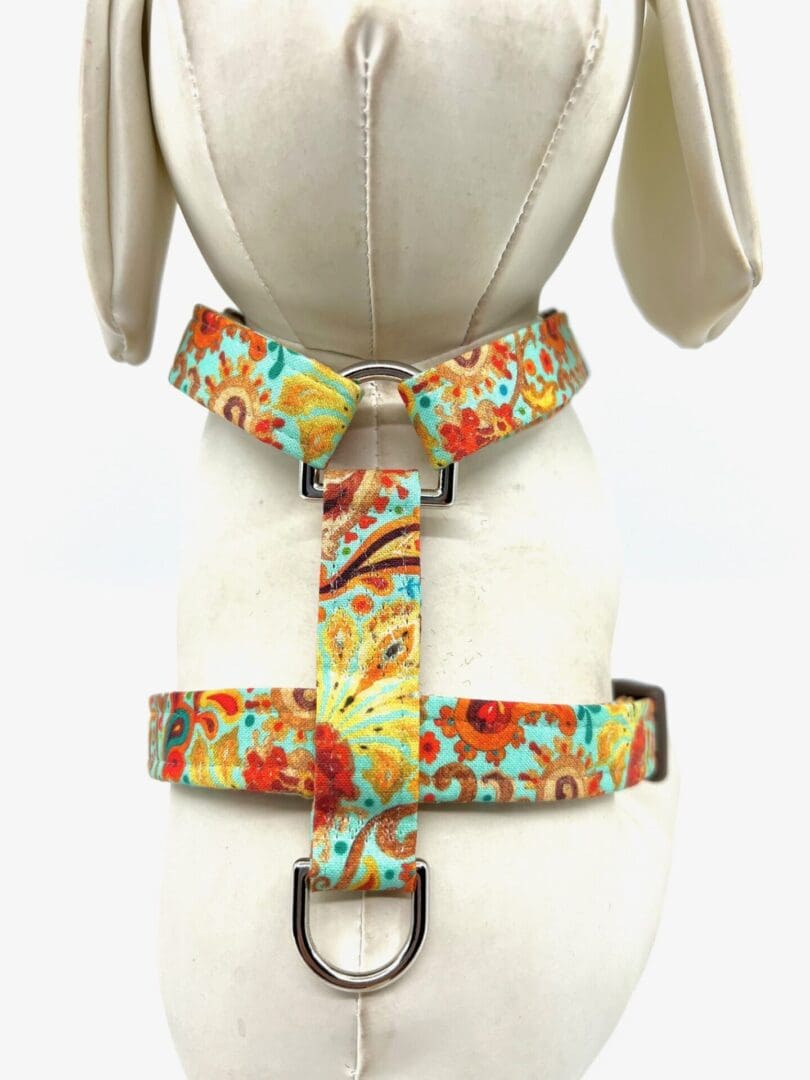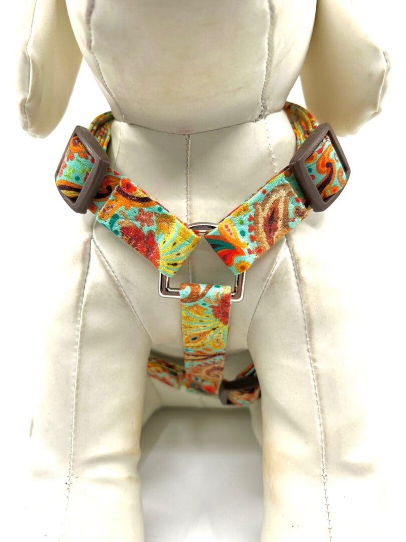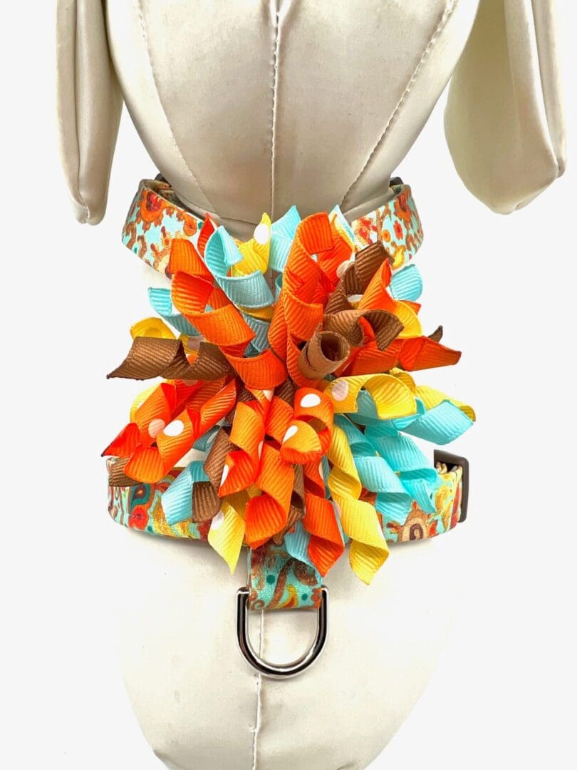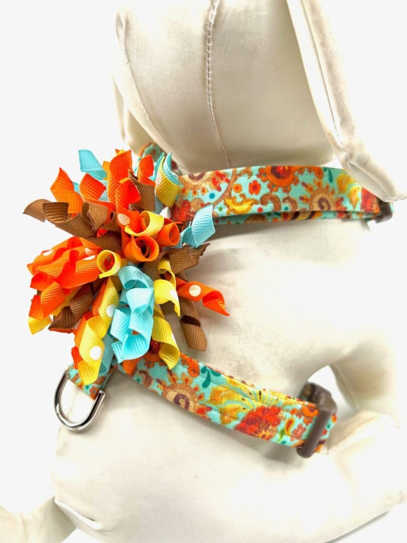 Fall Halloween Thanksgiving Teal Yellow Orange Brown Paisley Polka Dot Dog Harness- Add on Removable Bow or Korker Bow