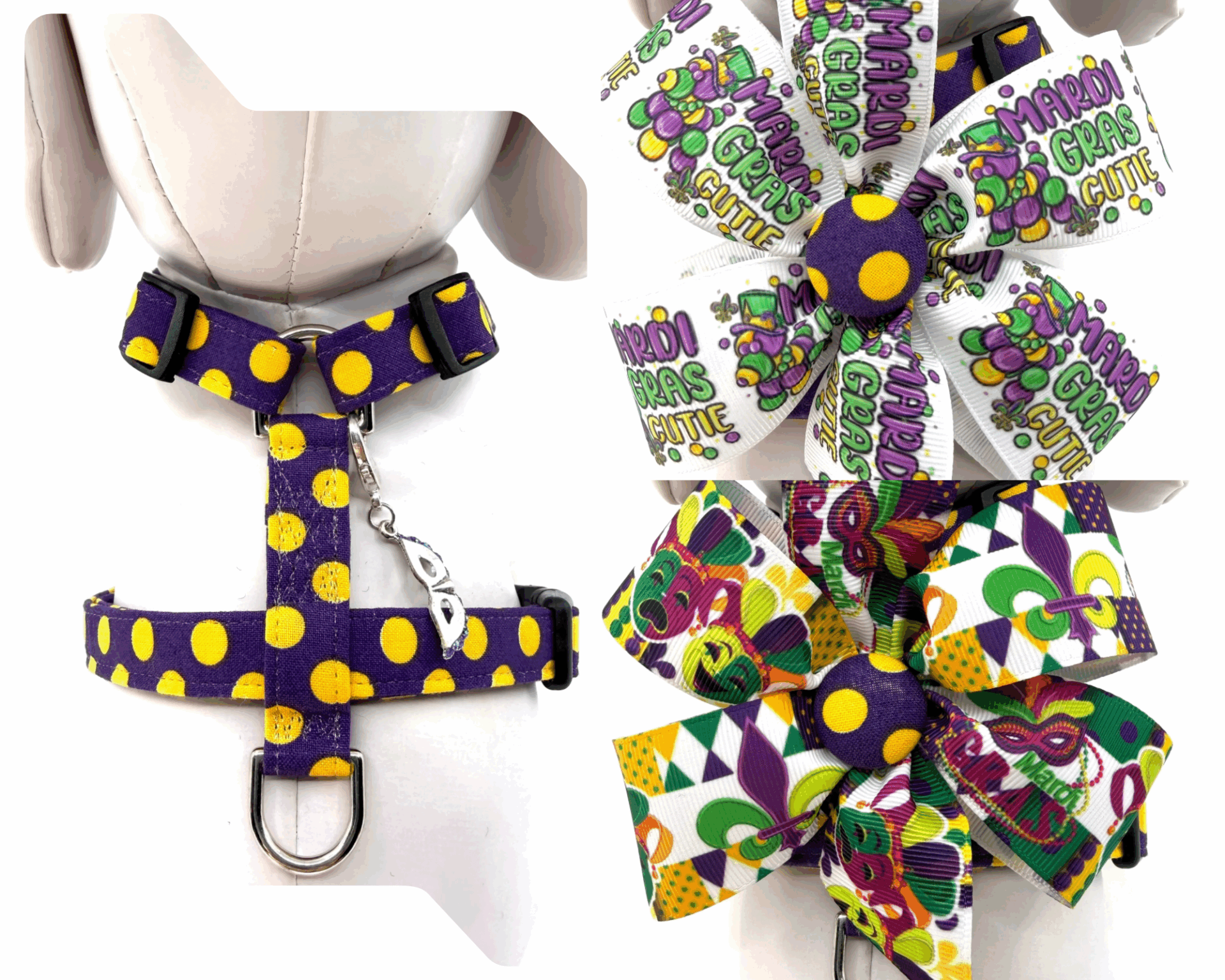 | Bow Style | HARNESS ONLY, ADD ON MARDI GRAS CUTIE BOW, ADD ON LE FLEUR MASK BOW |