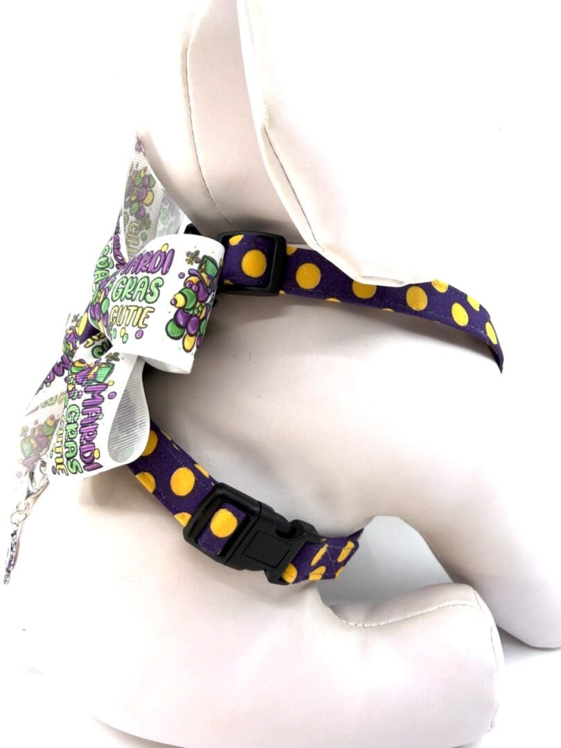 Mardi Gras purple with gold dots dog harness, choice of bow, adjustable harness, add on a removable bow