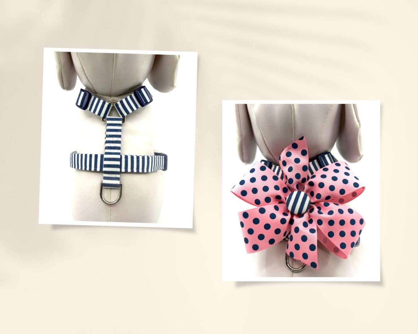 Spring Summer Navy White Striped Dog Harness- Add on a Removable Pink and Navy Polka Dot Bow